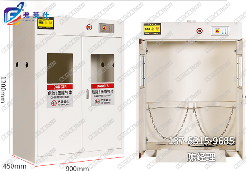 4)內(nèi)置雙不銹鋼卡圈(套鎖式)以固定氣瓶,翻推式墊板方便氣瓶推入;內(nèi)設排風口,便于泄漏的氣體排出,整體外形設計美觀大方;配有燃氣泄漏報警裝置,適合各種氣體氣瓶的存放。