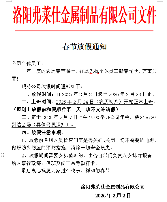 弗萊仕2026年春節(jié)放假通知